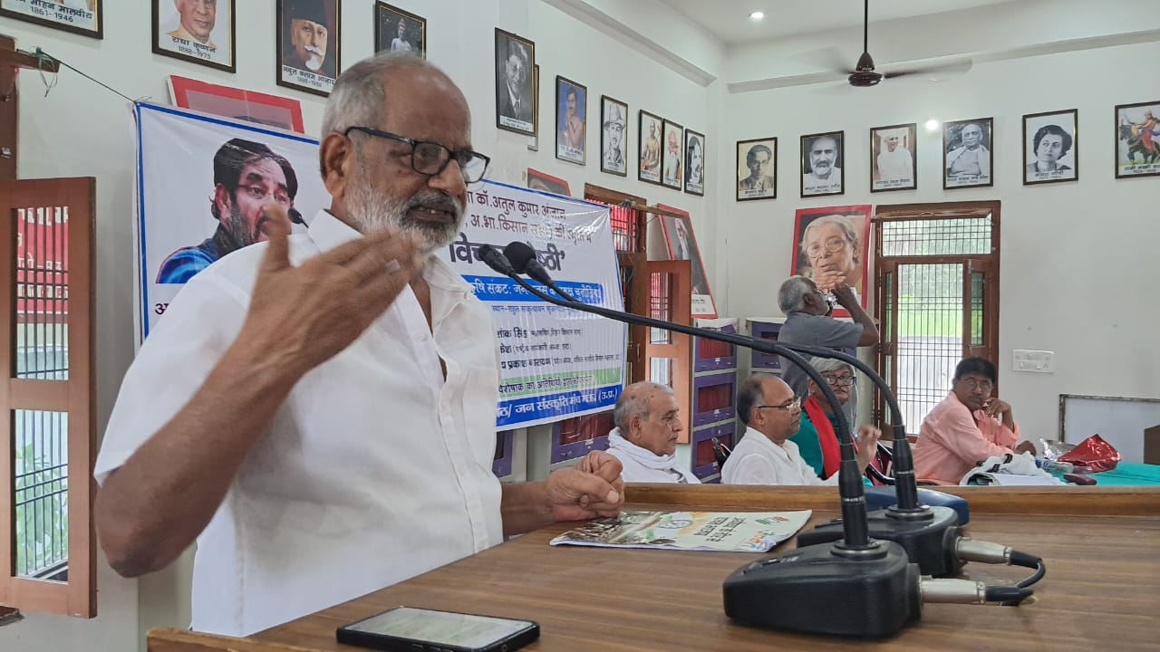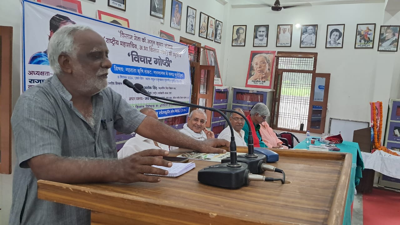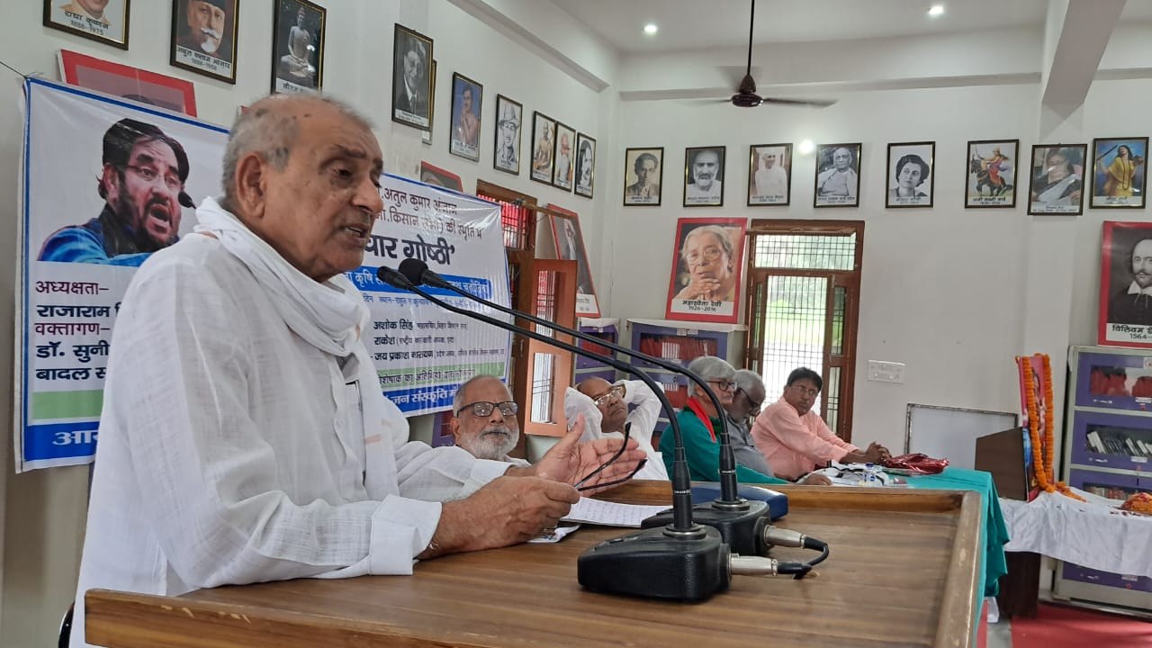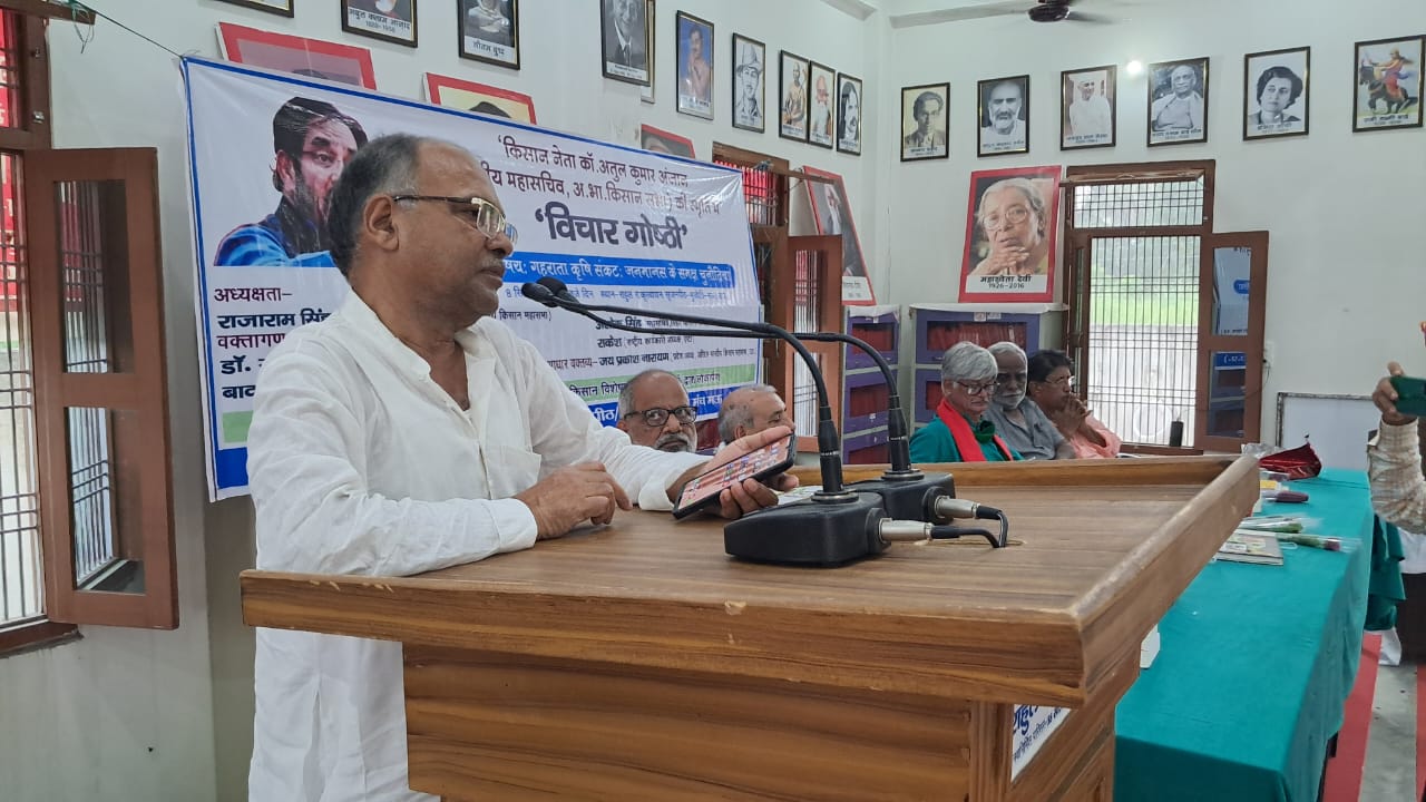 गोष्ठी में आधार व्यक्त वक्तव्य देते हुए अखिल भारतीय किसान महासभा के प्रदेश अध्यक्ष जयप्रकाश नारायण ने कहा कि भारतीय किसान आन्दोलन ने विश्व भर के किसानों को एकजुट करने का काम किया। उसका परिणाम यह हुआ कि सरकार को तीनों काले कानूनों को वापस लेना पड़ा। शुरु से ही किसानों के समक्ष गहराती समस्याओं से उबारने के लिए सरकारों द्वारा किए गए प्रयास केवल छलावा थे। वर्तमान में किसानों के सामने बड़ी कठिन चुनौती है। किसानों की अपेक्षा कार्पोरेट घरानों को फलने-फूलने का भरपूर मौका दिया जा रहा है। आज किसानों पर 21 लाख करोड़ की कर्जदारी है । एक दुश्चक्र चलाकर किसानों से उनकी जमीनें छीनी जा रही है और ये सब काम विकास के नाम पर किया जा रहा है।