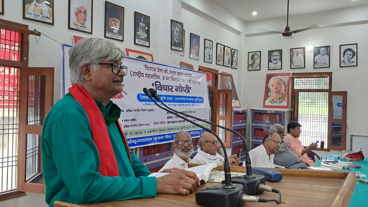 मऊ। अखिल भारतीय किसान सभा के महासचिव रहे जाने माने वाम नेता कॉमरेड अतुल कुमार अंजान की स्मृति में आज राहुल सांकृत्यायन सृजनपीठ, भुजौटी के सभागार में ‘ गहराता कृषि संकट : जनमानस के समक्ष चुनौतियां ‘ विषय पर एक विचार गोष्ठी का आयोजन किया गया। इस मौके पर डॉ.जयप्रकाश ‘धूमकेतु ‘ द्वारा संपादित पत्रिका ” अभिनव कदम “ के दो खण्डों में प्रकाशित किसान विशेषांक का लोकार्पण किया गया।